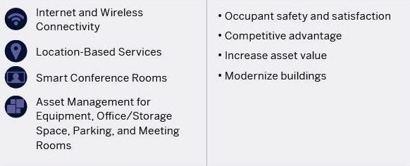 Most buildings have some level of embedded intelligence such as HVAC, lighting, and fire safety, etc. Although many buildings today are partially automated, what’s missing is a common framework that ties different lighting, security, HVAC, and energy systems together. Connecting these systems enables more intelligent facility functions, such as turning off lights and lowering the HVAC when a conference room is empty, versus waiting until 6PM.